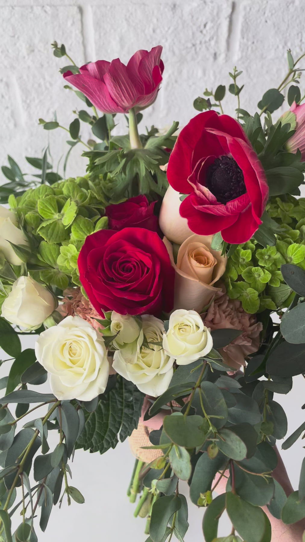 This premium hand-tied arrangement is loaded with anemones, roses, green hydrangea and eucalyptus accents. Finished with our signature burlap wrap.