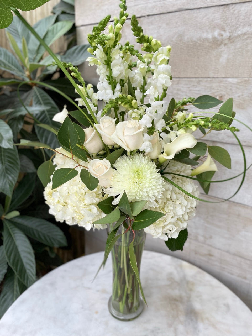 - Includes a mix of white blooms + greenery; exact flower varieties will differ from piece to piece, based on seasonal availability