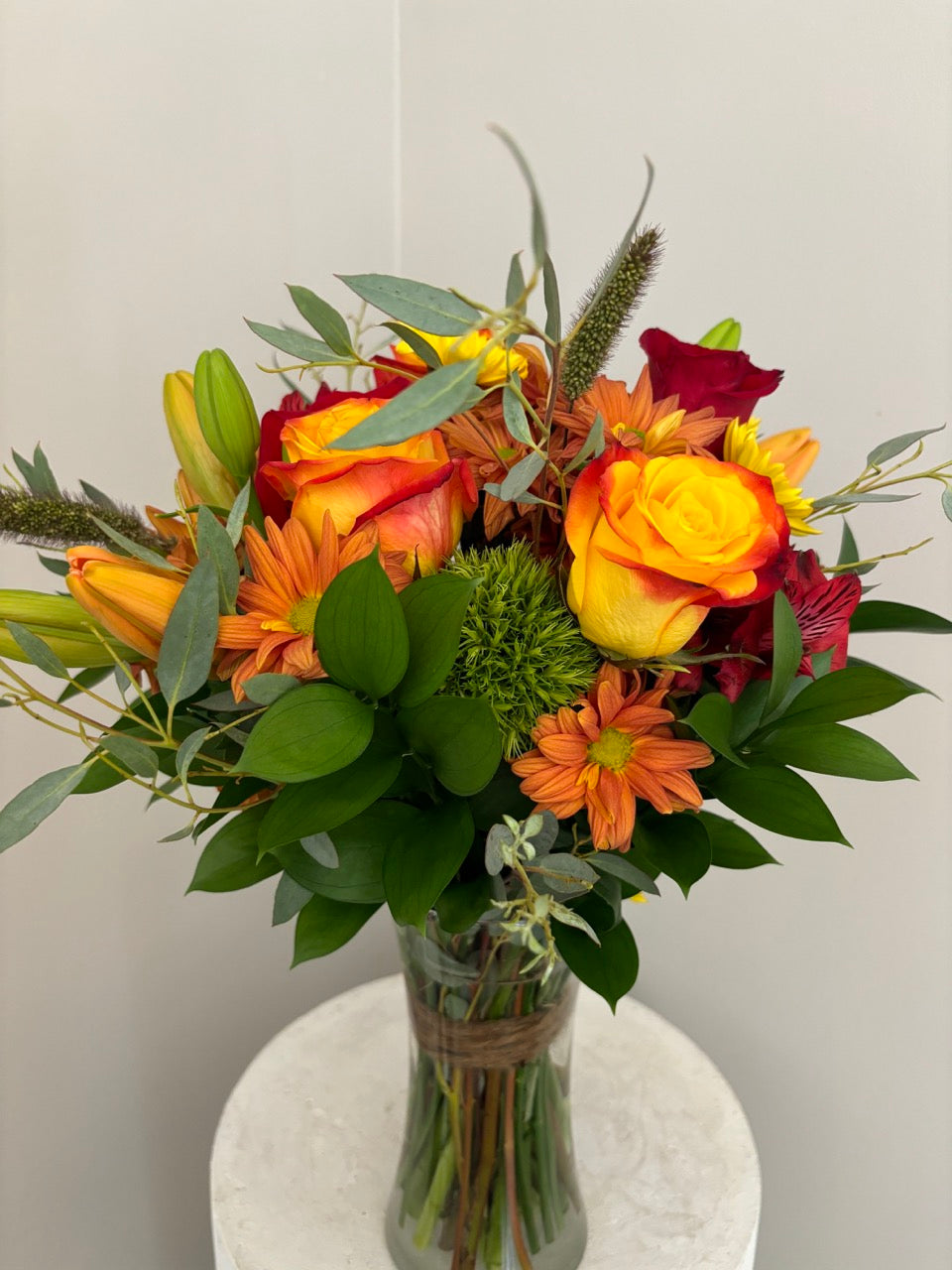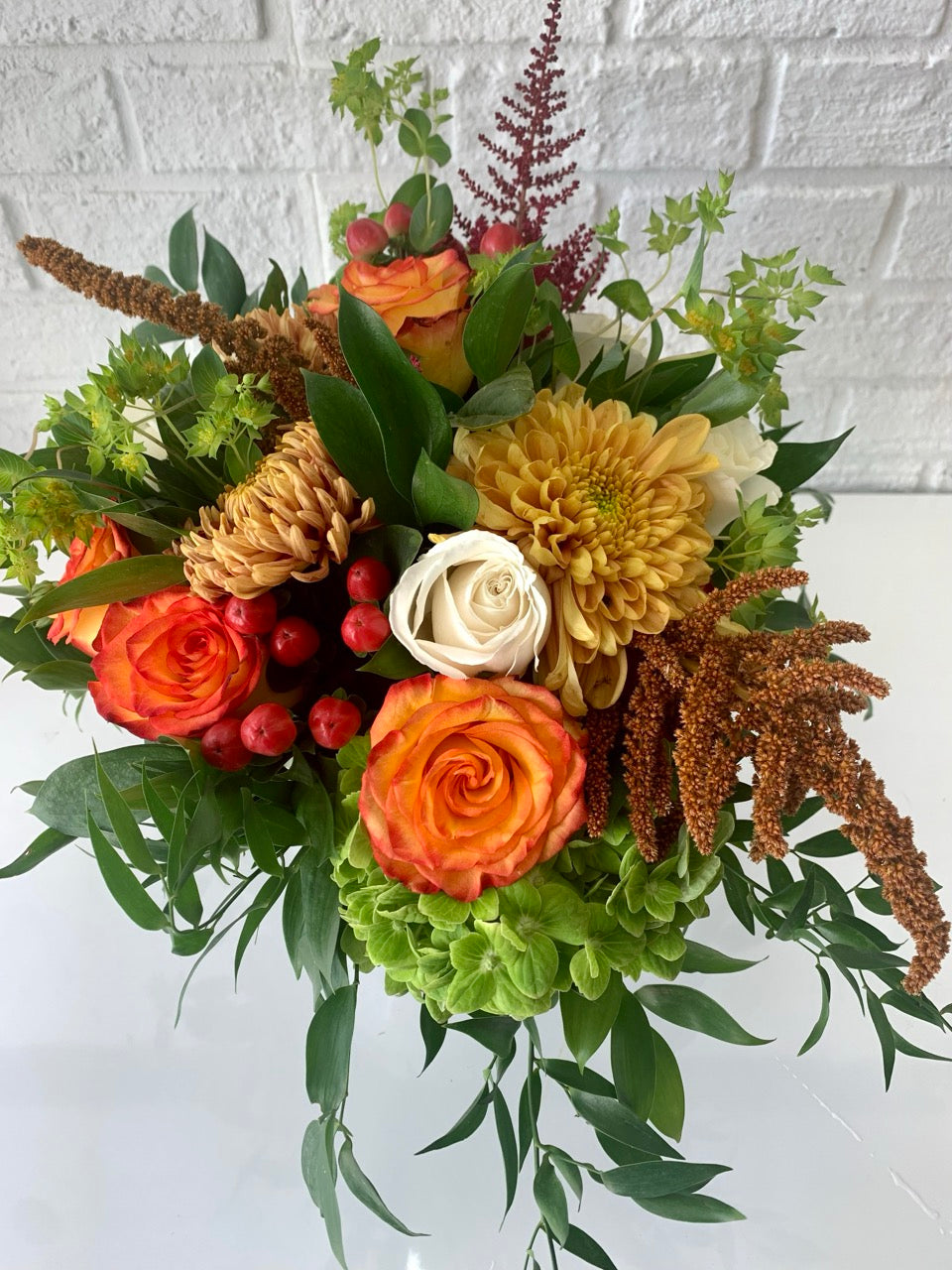 - Includes a mix of Fall-inspired blooms + greenery; exact flower varieties will differ from piece to piece, based on seasonal availability