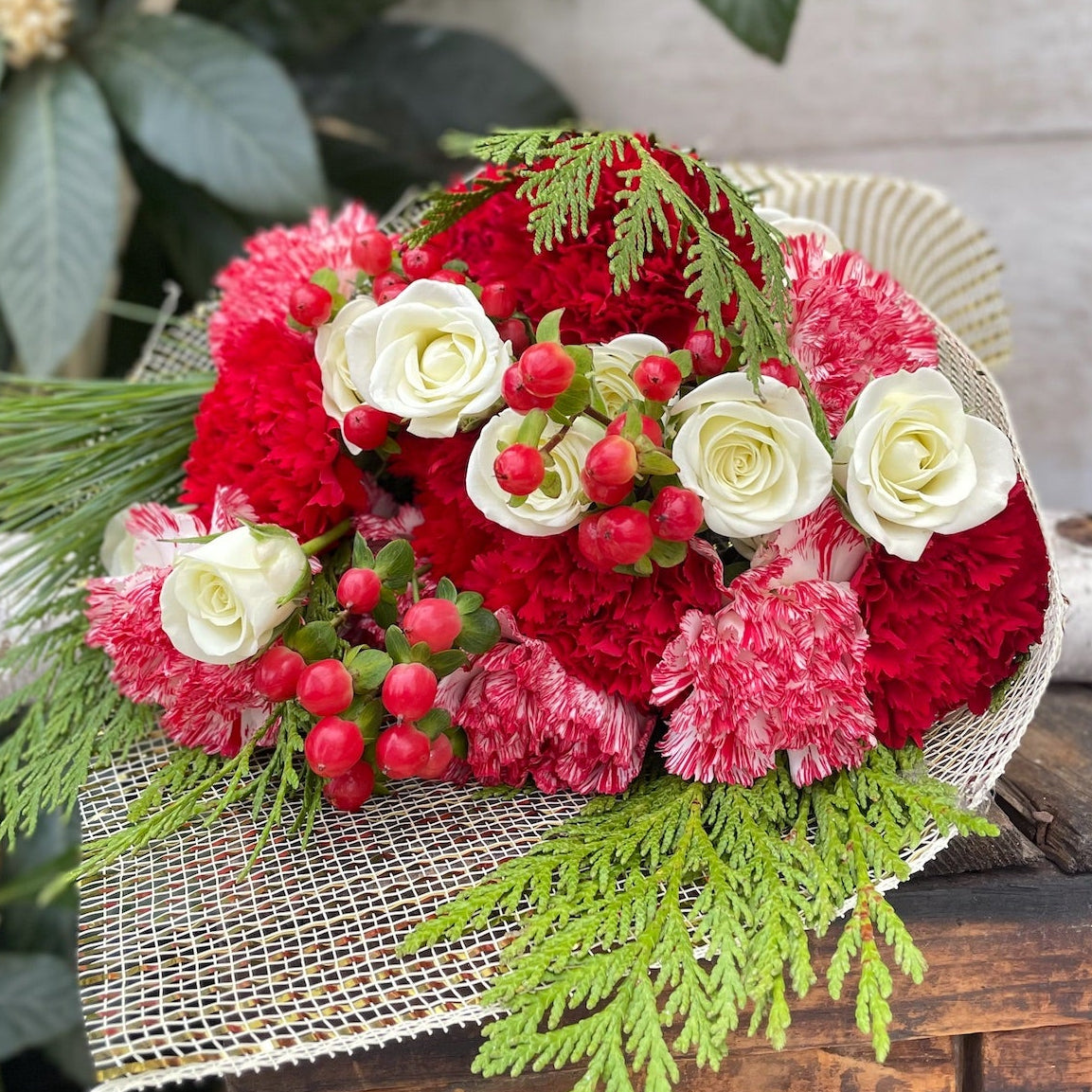 - Includes a mix of Winter-inspired blooms + greenery; exact flower varieties will differ from piece to piece, based on seasonal availability