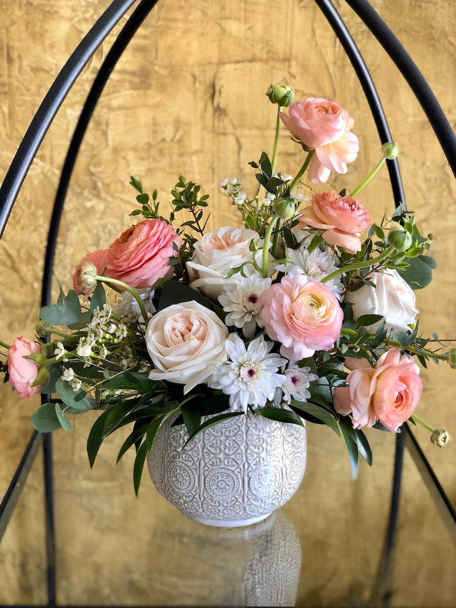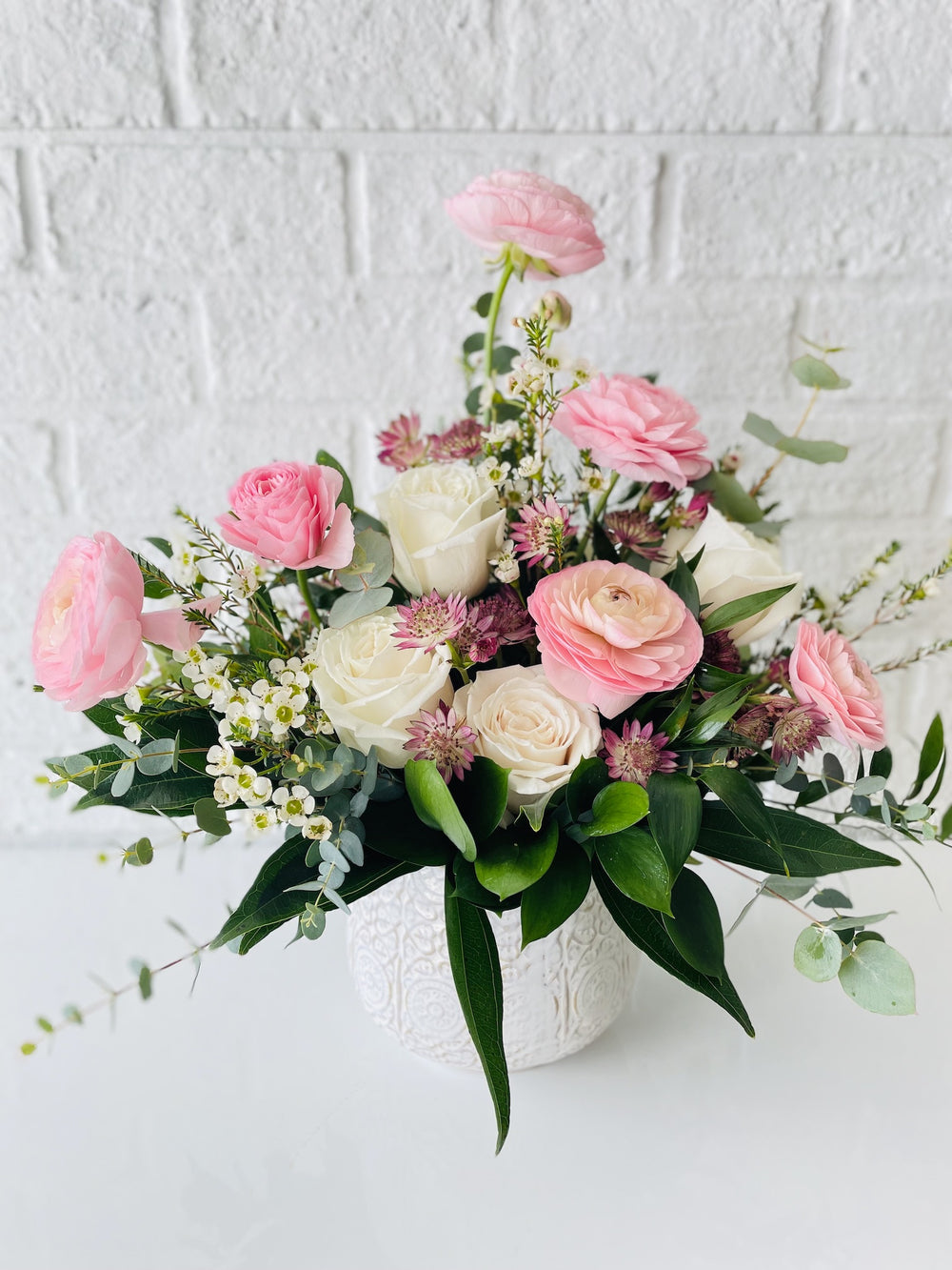 Vase arrangements are the perfect "no fuss" option, available in a variety of colours and styles – from traditional compact to boho-chic (loose and wild). All arrangements include an expertly matched ceramic or glass vase, as pictured.