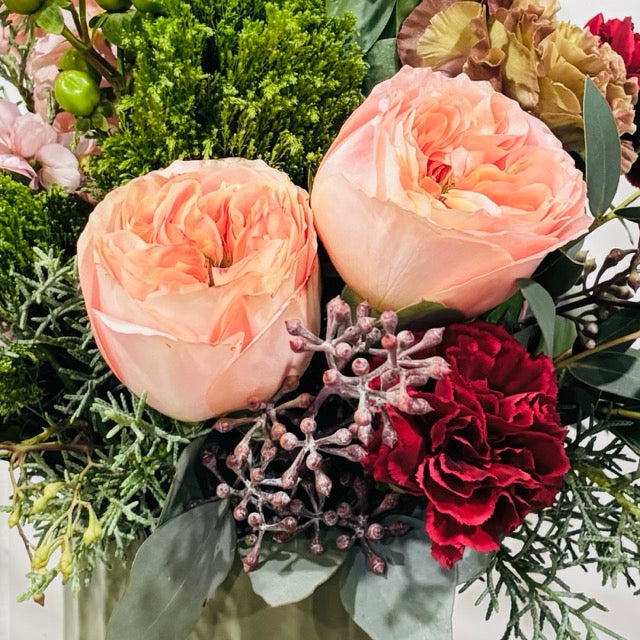 Peach garden roses, delicate stock, deep burgundy blooms, and textured evergreens come together to create a fresh, elegant centrepiece – arranged in a modern ribbed vase.